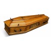 Trumna dębowa lakierowana. Białe, atłasowe obicie wewnętrzne. Antaby plastikowe zbrojone. Krzyż i zakrętki wieka plastikowe - stare złoto.