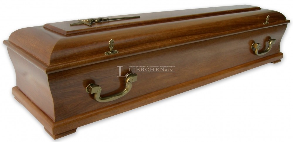Trumna wyposażona jest w zbrojone antaby, plastikowy krzyż oraz zakrętki wieka w kolorze starego złota (metalizacja). Sarkofagowe, białe z koronką, wybicie wnętrza trumny. Unikalny proces technologiczny pozwolił na uzyskanie kopułowego kształu wieka.