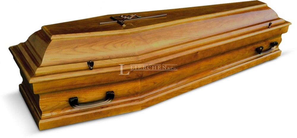 Trumna "łamana" z nakładanym wiekiem. Wnętrza sarkofagu obijane wysokiej jakości materiałem. Plastikowe antaby, zakrętki wieka i krzyż w kolorze starego złota. Lakier połysk.
