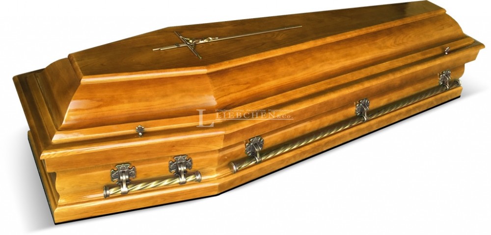 Trumna "łamana" z nakładanym wiekiem. Wnętrza sarkofagu obijane wysokiej jakości materiałem. Metalowe antaby, zakrętki wieka i krzyż w kolorze starego złota. Lakier poliestrowy.