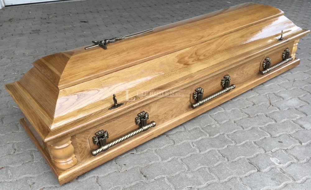 Trumna dębowa. Białe, atłasowe obicie wewnętrzne. Antaby plastikowe zbrojone. Krzyż i zakrętki wieka plastikowe - metalizacja złota. we wkład metalowy.