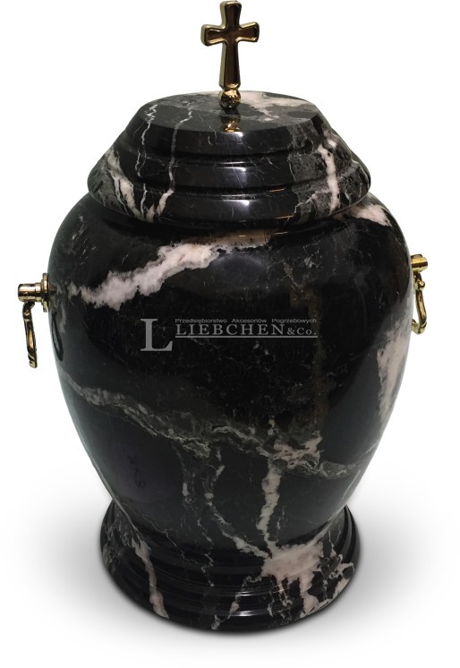 Urna wykonana z czarnego marmuru, polerowanego na wysoki połysk. Ozdobiona złoconym krzyżykiem u szczytu oraz złoconymi uchwytami.