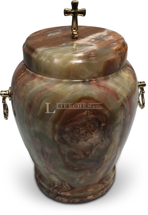 Urna wykonana z onyxu, polerowanego na wysoki połysk. Ozdobiona złoconym krzyżykiem u szczytu oraz złoconymi uchwytami.