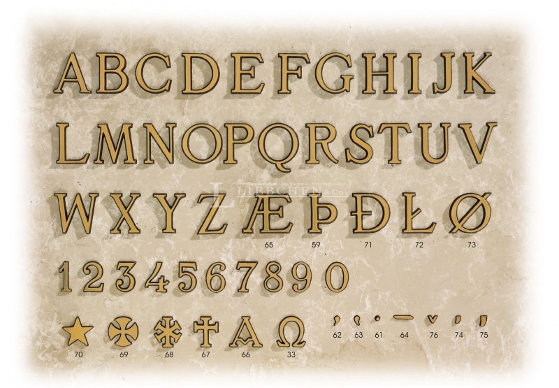 Litery nagrobne wykonane z brązu, zabezpieczone warstwą lakieru, która nie pozwala na interakcję materiału z otoczeniem. Są one całkowicie odporne na zmiany atmosferyczne dzięki czemu z powodzeniem mogą być stosowane zarówno w pomieszczeniach jak i na zewnątrz.