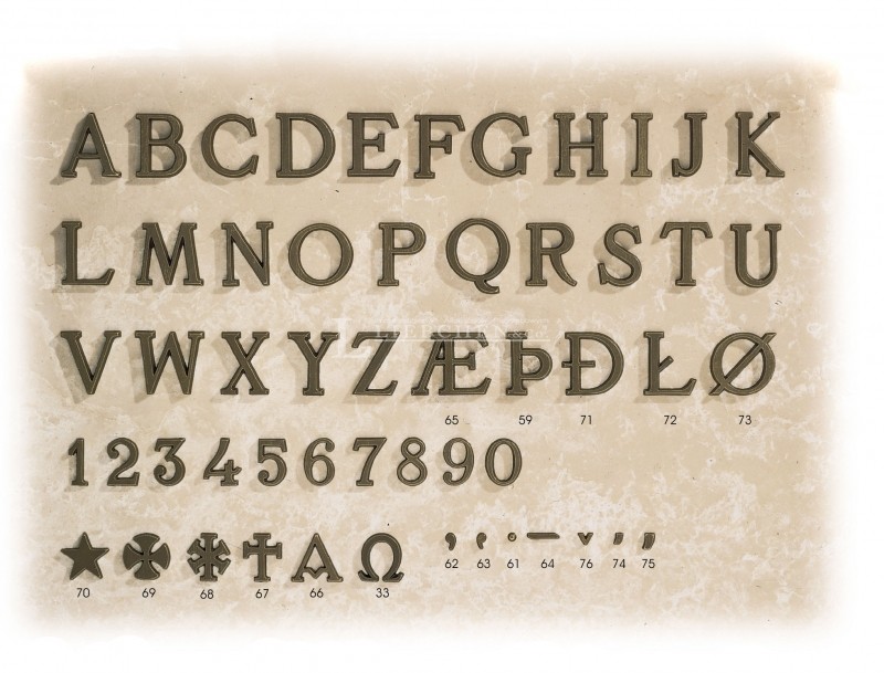 Litery nagrobne wykonane z brązu, zabezpieczone warstwą lakieru, która nie pozwala na interakcję materiału z otoczeniem. Są one całkowicie odporne na zmiany atmosferyczne dzięki czemu z powodzeniem mogą być stosowane zarówno w pomieszczeniach jak i na zewnątrz.