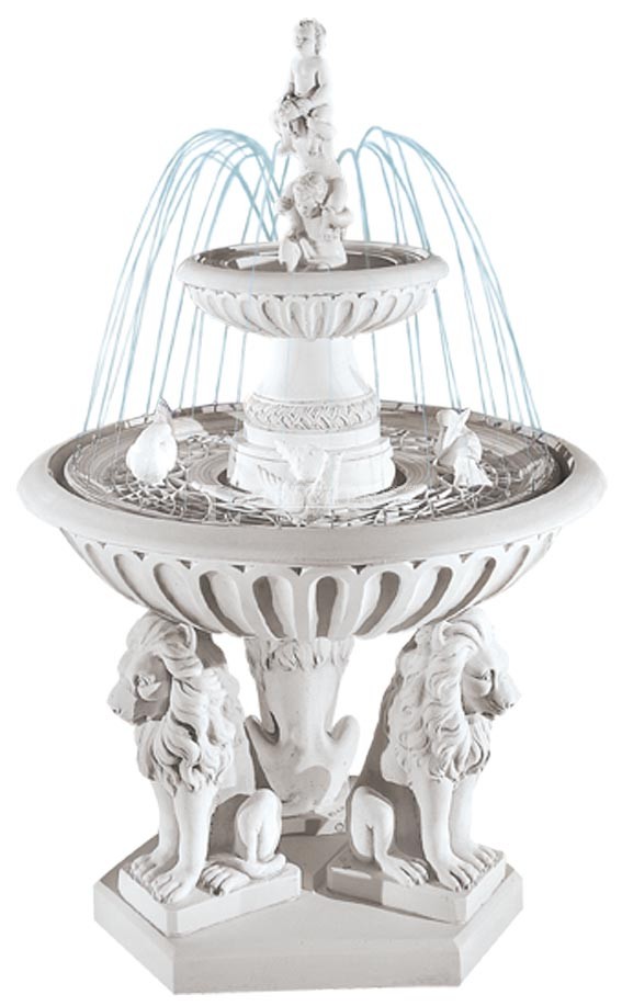 Fontanna z trzema lwami u podstawy, dwoma ptaszkami pływającymi w jej wnętrzu. U nasady znajdują się dwie postacie dziecięce. Fontanna ta wykonana jest z niezmierną precyzją, wykańczana ręcznie przez włoskich artystów.